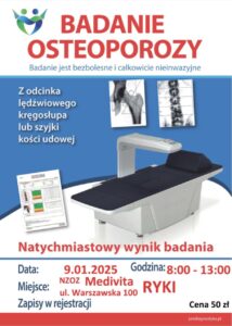 UWAGA! Informujemy, że rozpoczynamy zapisy na badanie w kierunku osteoporozy, które będzie realizowane 9 stycznia 2025 r. w placówce NZOZ Medivita przy ul. Warszawskiej 100 w Rykach, w godz. 8-13.